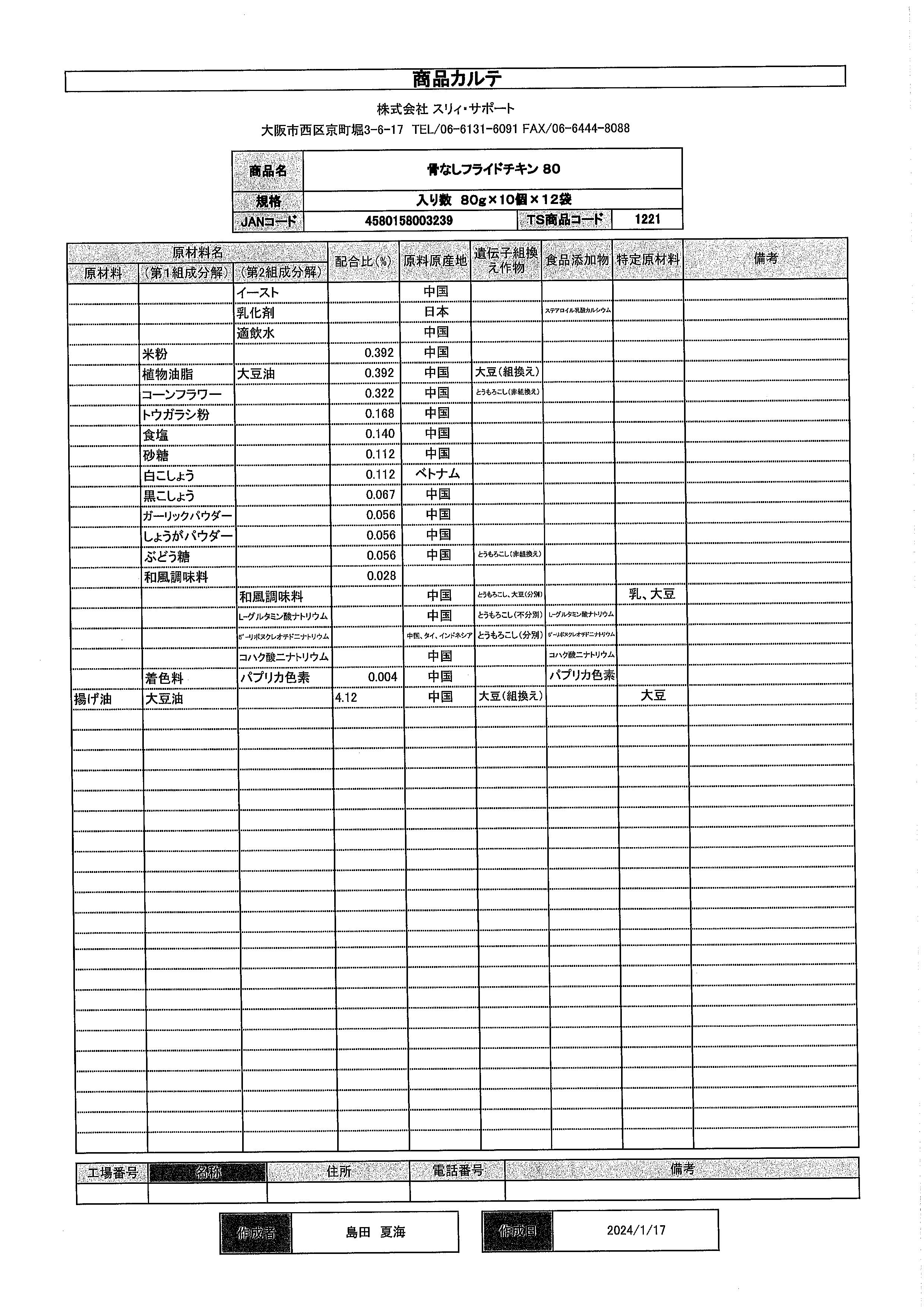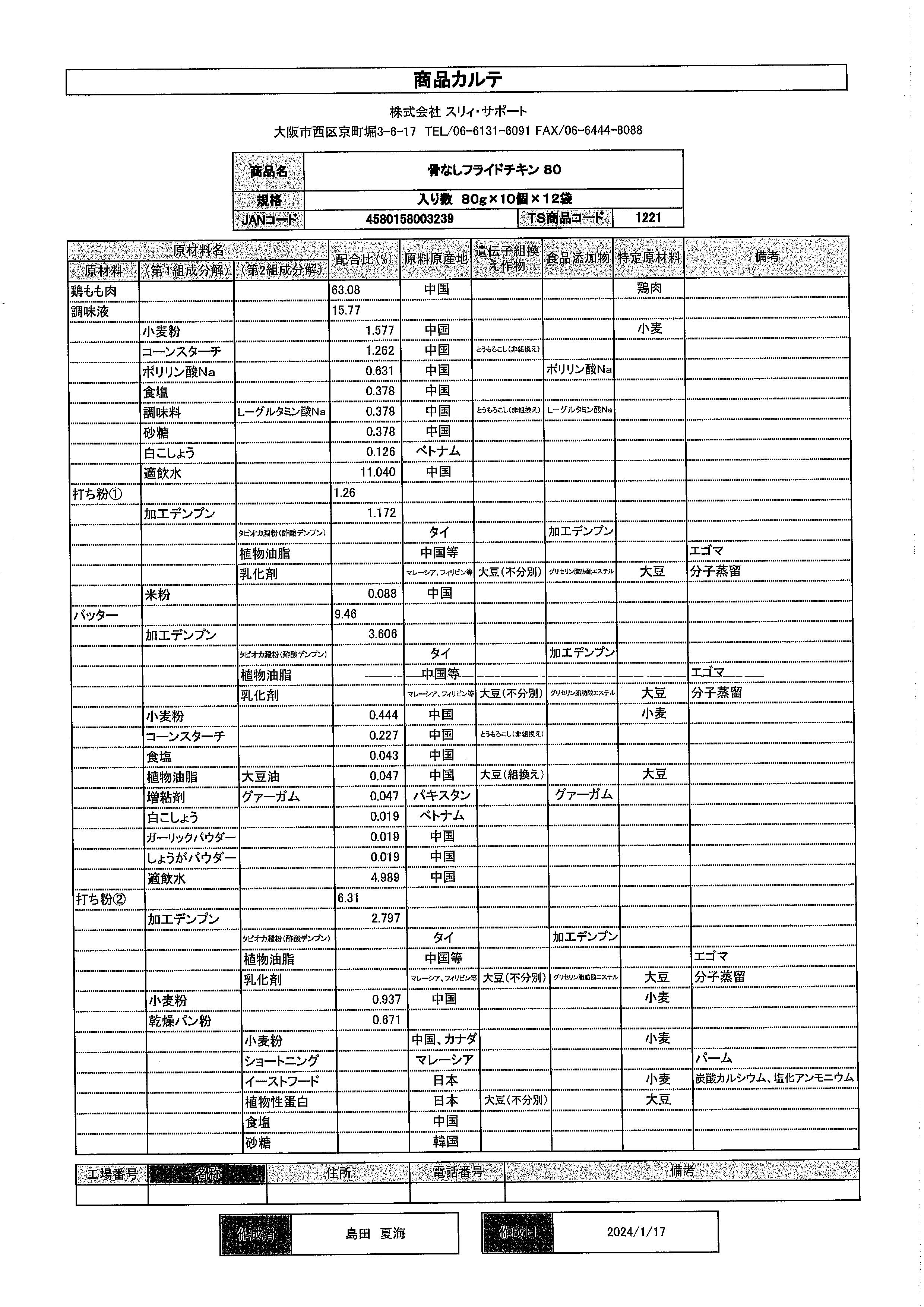 調理方法:凍ったままの製品を170°~175°の油で、油調を調整しながら約6分30秒~7分間を目安に十分に加熱して揚げて下さい。