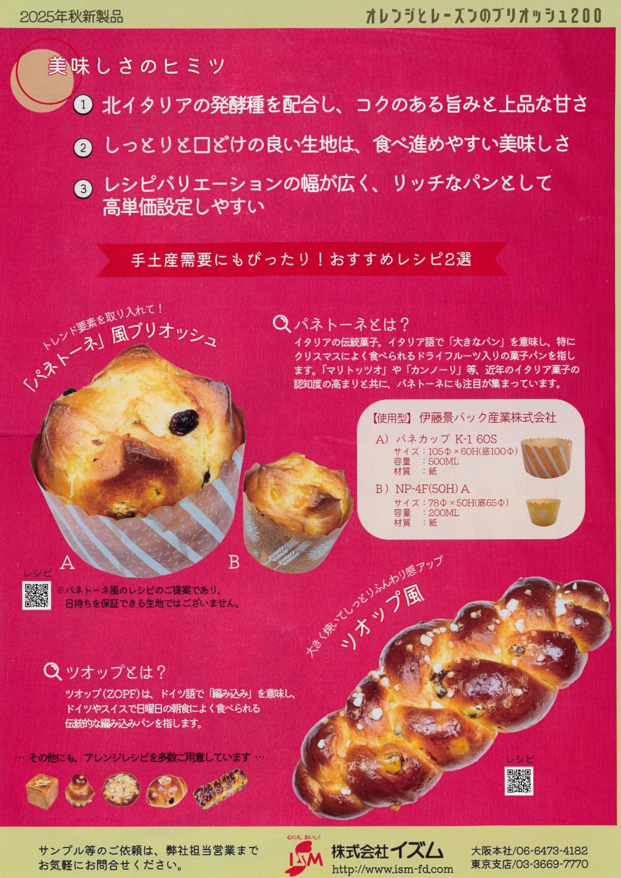 しっとりと口溶けの良いブリオッシュ生地に、オレンジピールとレーズンを練り込んだパネトーネ風ブリオッシュ生地です。