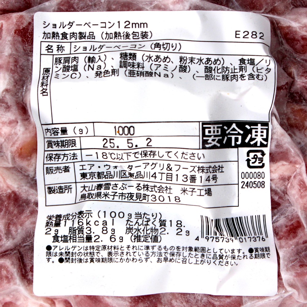 ショルダーベーコンとは豚肩肉を使用し、ベーコンと同様の製法で作ったもので、ベーコンより脂肪が少ないことと、価格的に安くなるという利点があります。肩肉を使用しているため、水分量がハム同様に多く含まれておりますが、ダイス状にカット整形ができ、焼き込み用やピザのトッピングなど用途は幅広くご使用できます。