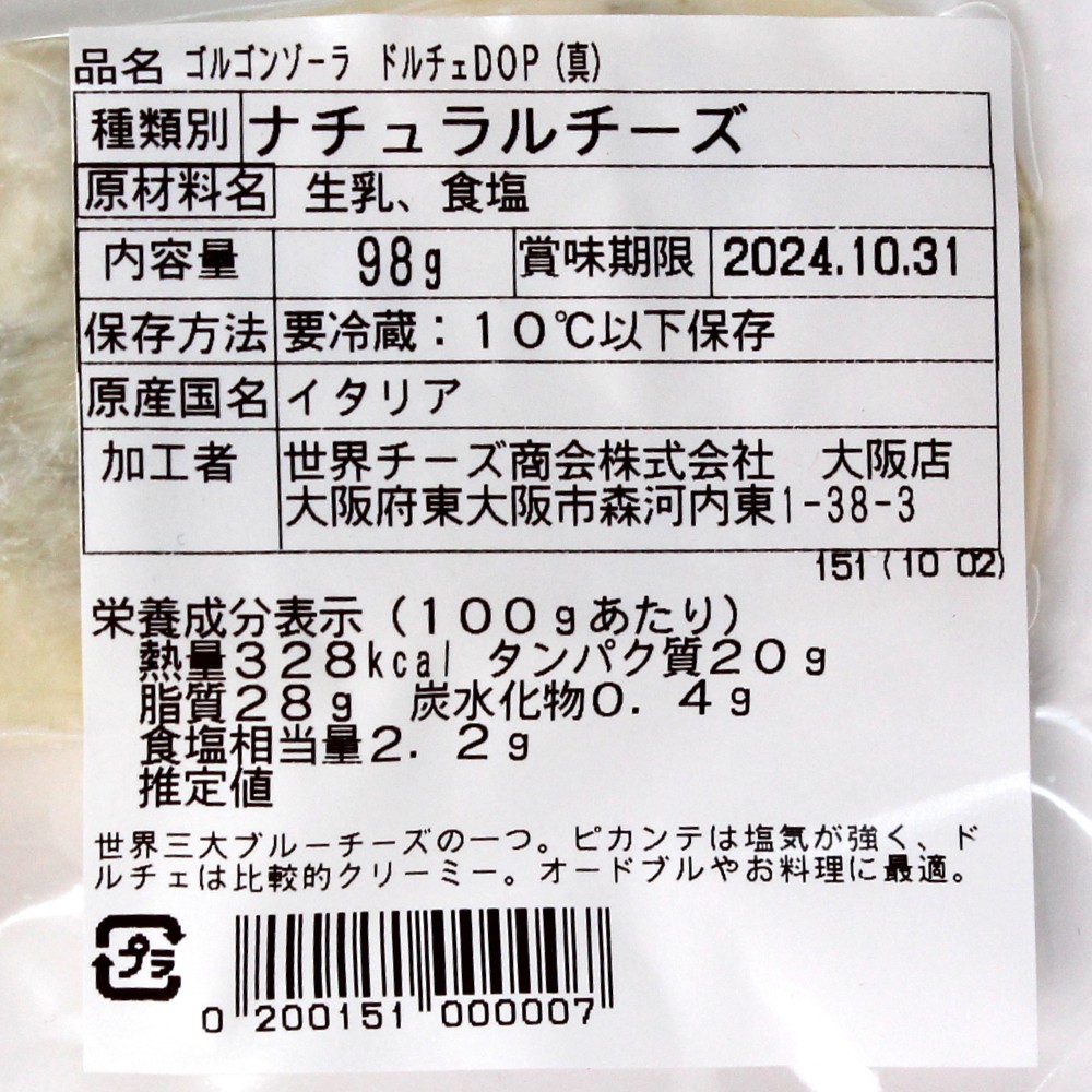 ドルチェタイプのゴルゴンゾーラは、生地がソフトで青カビが少なく、クリーミーな口どけ。刺激は穏やかなイタリアのブルーチーズです。