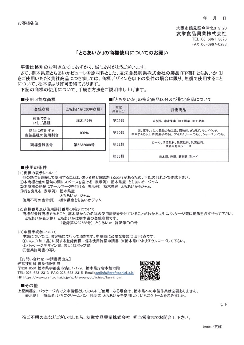 ※注)パンなどの「商品名」に"とちあいか"という言葉を入れるには商標の使用の申請が必要です。(商品の説明書きに"とちあいか"を書くのは申請不要)