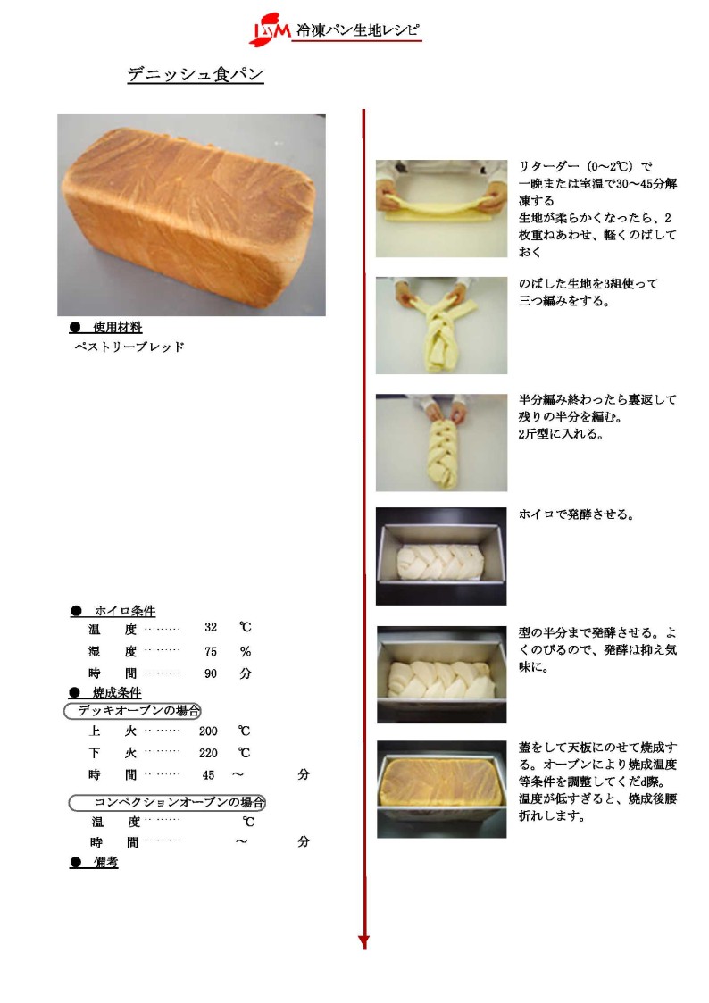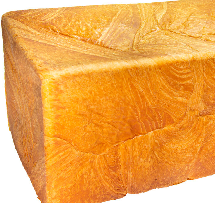 リッチな配合の生地に加糖油脂を折り込みました。サイズ280×50mm/24層。生地を2枚重ねにし、それを3組用意して三つ編みにすれば、2斤分のデニッシュ食パンになります。 カリッとした皮の中からほんのり漂う甘いミルクの風味が特長です。