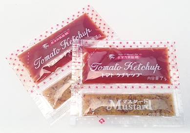 ケチャップ7gとマスタード3gがペアになった持ち帰り用小袋商品です。