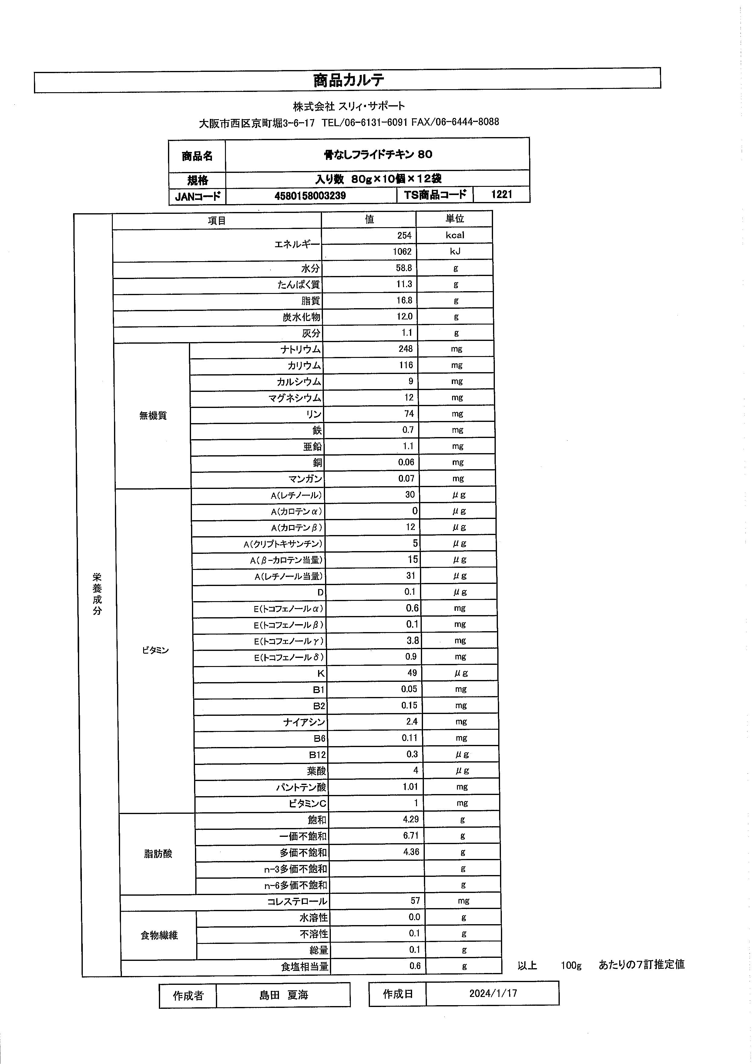 調理方法:凍ったままの製品を170°~175°の油で、油調を調整しながら約6分30秒~7分間を目安に十分に加熱して揚げて下さい。