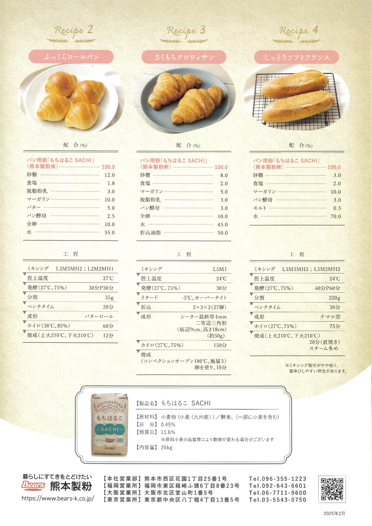 もち小麦を100%使うと「お餅」とそっくりな状態になってしまって、パンなどを作れないので、こちらの「もちはるこ-SACHI-」は九州産小麦とブレンドし、酵素を入れることで、柔らかさともちもち感が長持ちする、そのまま使える「もち小麦入り国産強力粉」です。