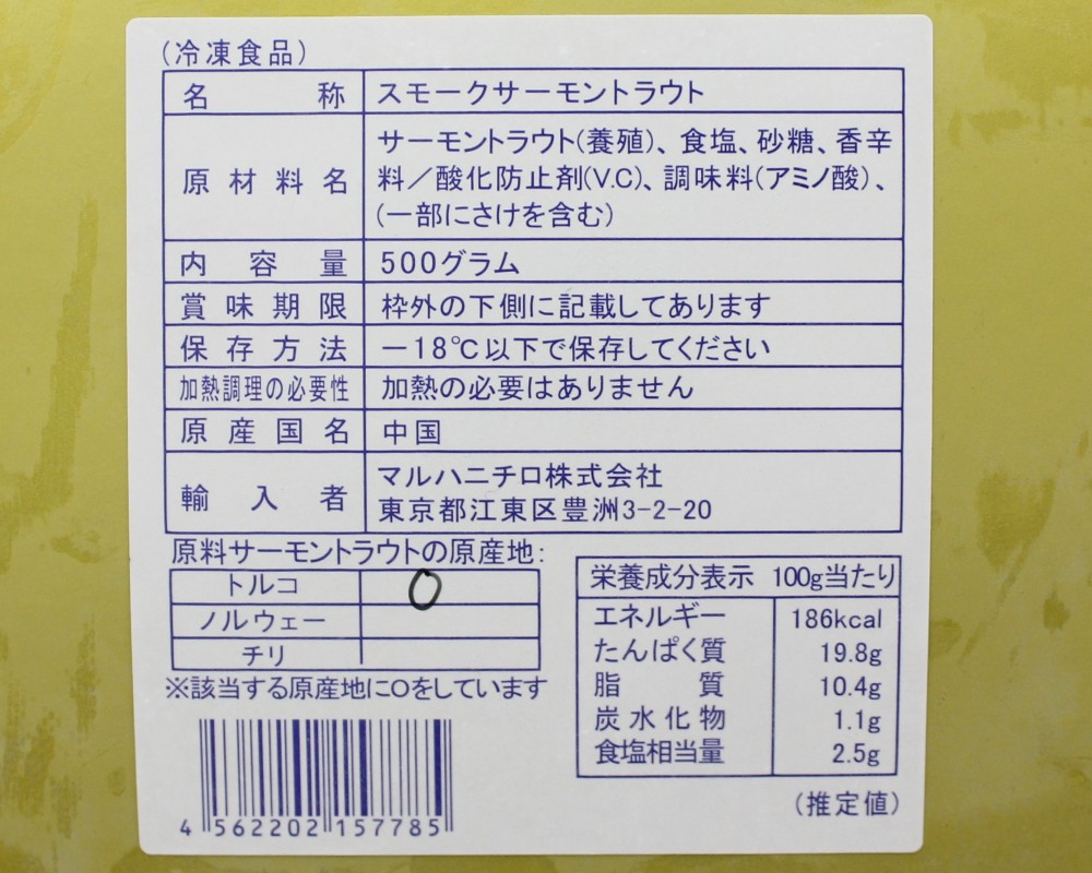 チリまたはノルウェーまたはトルコ産のサーモンを使用したスモークサーモン。(産地はロットによって変わります)