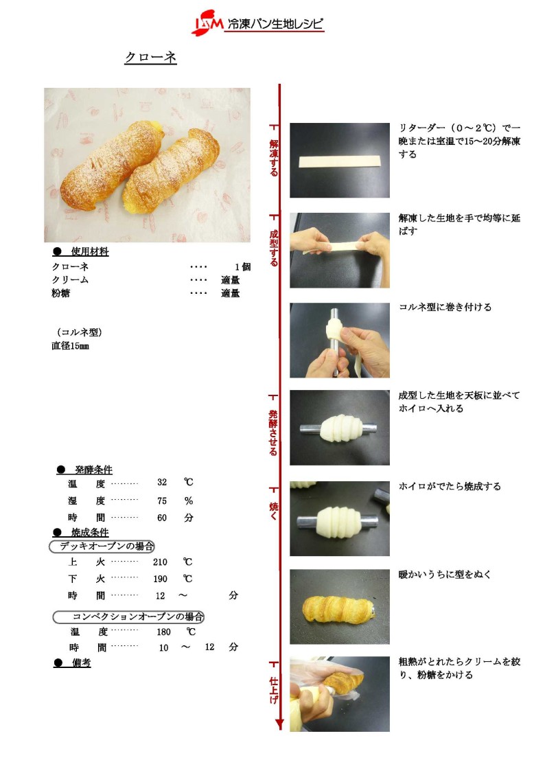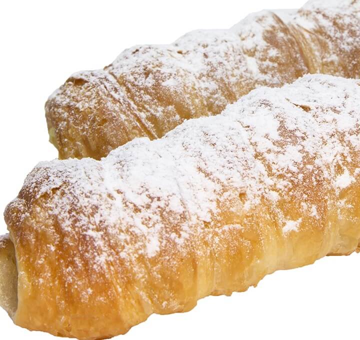 比較的リーンな配合の生地にマーガリンを折り込んだペストリーです。サイズ195×25mm/24層。生地を芯棒に巻きつけて焼成し、カスタードクリームやチョコレートクリームを絞り込めば、おいしいデザートができあがります。ホイロなしでも焼成できます。