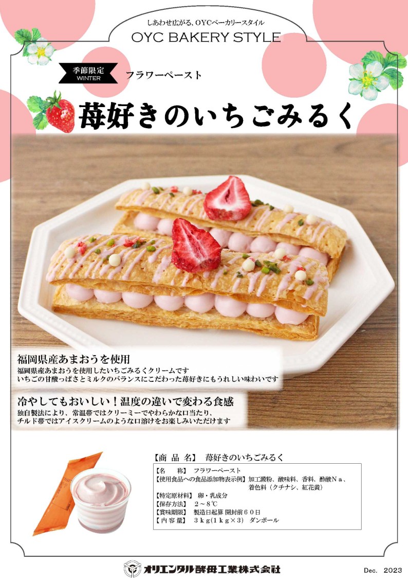 【苺好きのいちごみるく】温度によって口溶けが変わる苺クリーム。冷やすとアイスクリームのような口溶けになる特徴を活かしてミニクリスマスケーキのようなパンにして冷蔵販売すると良さそう。レシピの「白いいちごみるくパン」は冷やすと「雪見だいふく風」かも?
